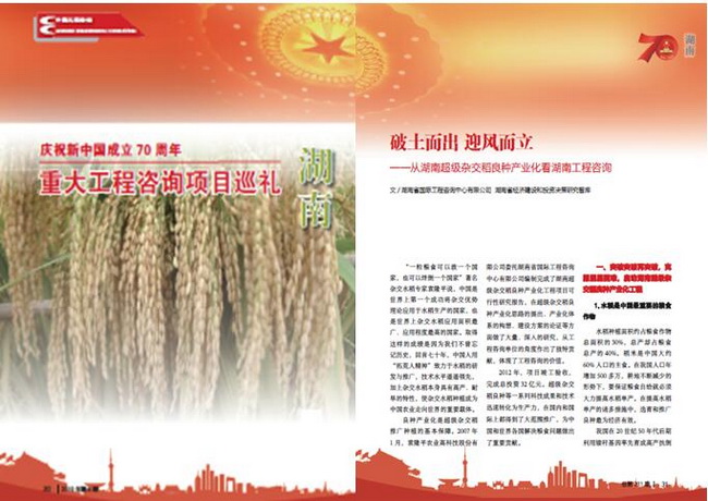 省咨詢公司完成的《湖南超級雜交稻良種產(chǎn)業(yè)化工程可行性研究報告》作為湖南唯一申報的工程咨詢成果,參展了中國工程咨詢協(xié)會“慶祝新中國成立70周年重大工程咨詢項(xiàng)目巡禮”,在《中國工程咨詢》雜志上刊登展示。公司工程咨詢成果獲此殊榮,體現(xiàn)了公司咨詢成果的品質(zhì)和質(zhì)量達(dá)到了一流水平,得到了國家和湖南省工程咨詢行業(yè)的高度關(guān)注和廣泛認(rèn)可。