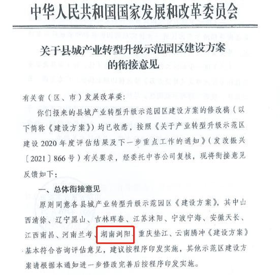 根據(jù)《國家發(fā)展改革委 科學(xué)技術(shù)部 工業(yè)和信息化部 自然資源部關(guān)于產(chǎn)業(yè)轉(zhuǎn)型升級示范區(qū)建設(shè)2020年度評估結(jié)果及下一步重點工作的通知》(發(fā)改振興〔2021〕866號),瀏陽經(jīng)開區(qū)成功入選國家級縣城產(chǎn)業(yè)轉(zhuǎn)型升級示范園區(qū)?!斗桨浮繁皇“l(fā)展改革委、省科技廳、省工信廳和省自然資源廳聯(lián)合印發(fā)。