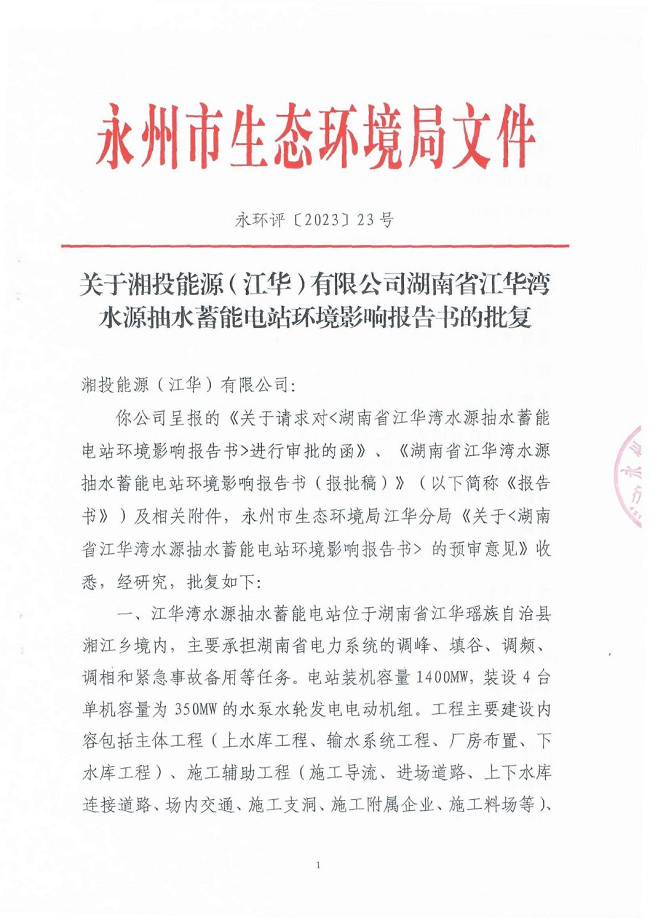 近日,我司環(huán)境保護(hù)咨詢(xún)事業(yè)部負(fù)責(zé)撰寫(xiě)的《湖南省江華灣水源抽水蓄能電站環(huán)境影響報(bào)告書(shū)》,順利通過(guò)了永州市生態(tài)環(huán)境局的評(píng)審并取得批復(fù)(永環(huán)評(píng)〔2023〕23號(hào))。