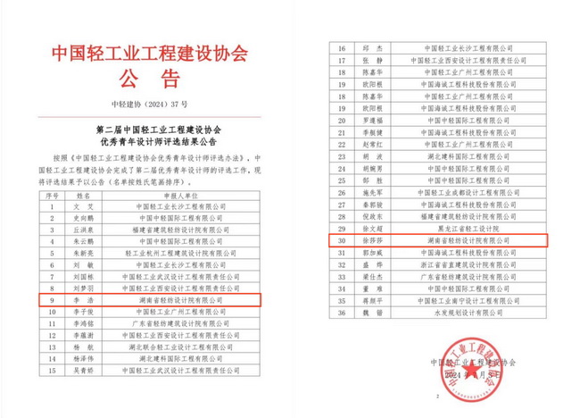 近日,中國輕工業(yè)工程建設(shè)協(xié)會(huì)正式公布了“第二屆中國輕工業(yè)工程建設(shè)協(xié)會(huì)優(yōu)秀青年設(shè)計(jì)師”評(píng)選結(jié)果,湘咨集團(tuán)所屬省輕紡院李浩、徐莎莎2名專家榮獲“第二屆中國輕工業(yè)工程建設(shè)協(xié)會(huì)優(yōu)秀青年設(shè)計(jì)師”榮譽(yù)稱號(hào)。