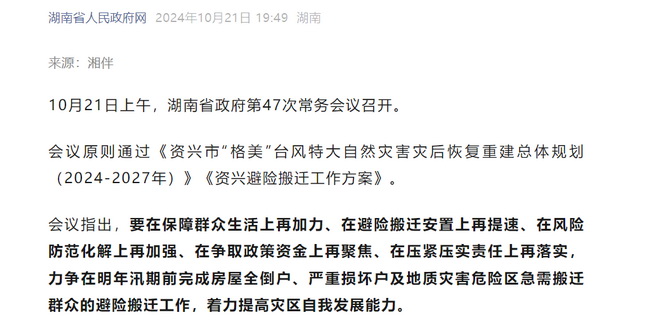 10月21日上午,湖南省政府第47次常務(wù)會(huì)議召開(kāi),會(huì)議原則通過(guò)了由湘咨集團(tuán)編制的《資興市“格美”臺(tái)風(fēng)特大自然災(zāi)害災(zāi)后恢復(fù)重建總體規(guī)劃(2024-2027······