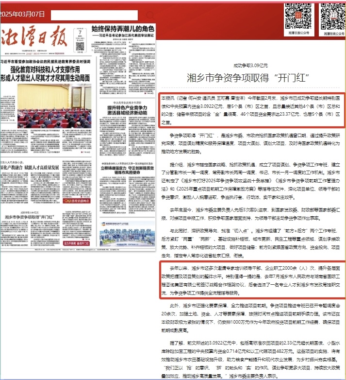 2025年3月6日,據(jù)湘潭日報報道,截至2月末,湘鄉(xiāng)市成功爭取超長期國債和中央預(yù)算內(nèi)資金3.092億元,儲備項目資金需求23.37億元,兩項指標領(lǐng)跑湘潭市縣區(qū)?!ぁぁぁぁぁ?/p>